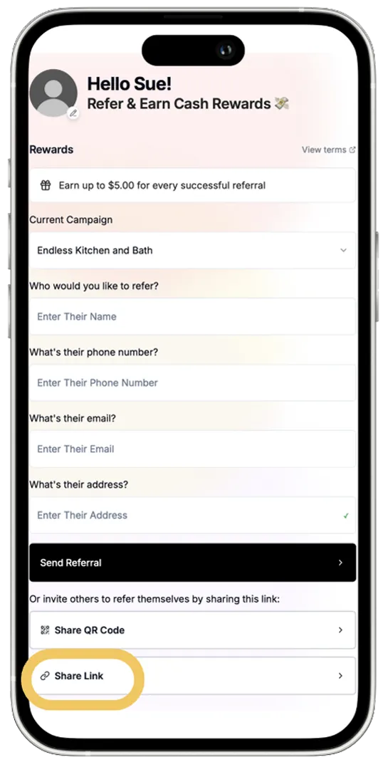 Promoters can send a direct referral or use the "Share Link" feature to send to friends.