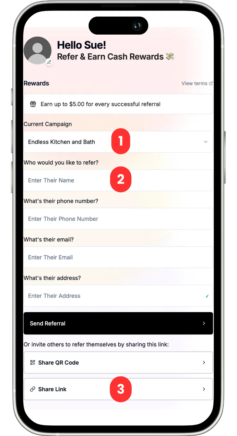 The referred friend completes the lead form or is referred directly to your business. When the lead form is submitted, the referral will automatically show up in your Referral Pipeline.